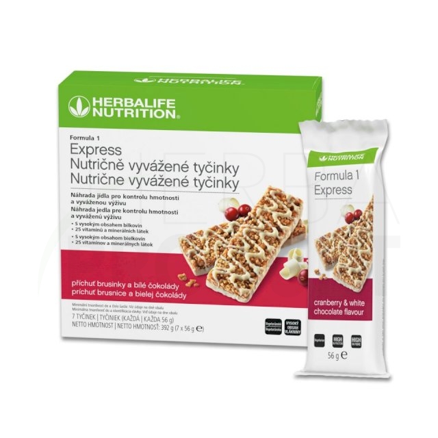 Tyčinky Formula 1 Express s příchutí brusinek a bílé čokolády jsou lahodnou náhradou jídla, kombinující křupavou ovesnou vločku a brusinky, zalité bílou čokoládou. Díky této nutričně vyvážené tyčince, bohaté na bílkoviny, vlákninu a obsahující 25 vitamínů a minerálů, nemusíte nikdy opomíjet jídlo.
