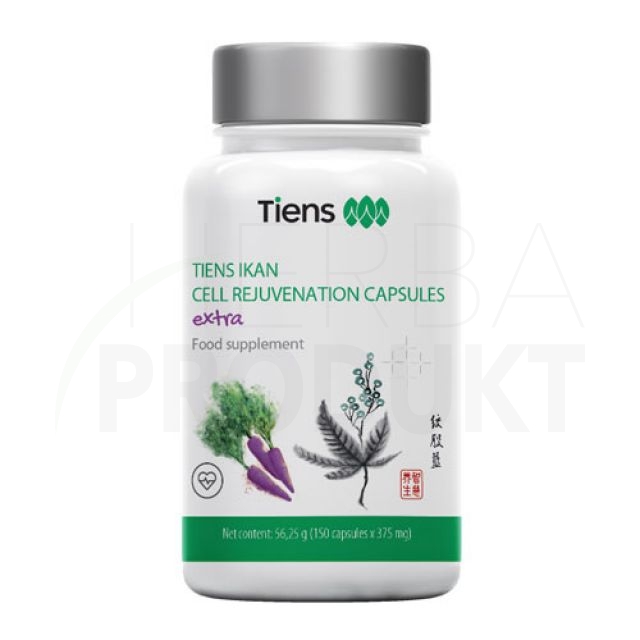 Doplněk stravy obsahující prášek z fialové mrkve, výtažky z listů gynostemmy a výtažky z listů zeleného čaje. TIENS Ikan Extra je také bohatý na vitamín C a chrom. Čistý obsah: 56,25 g (150 kapslí x 375 mg).